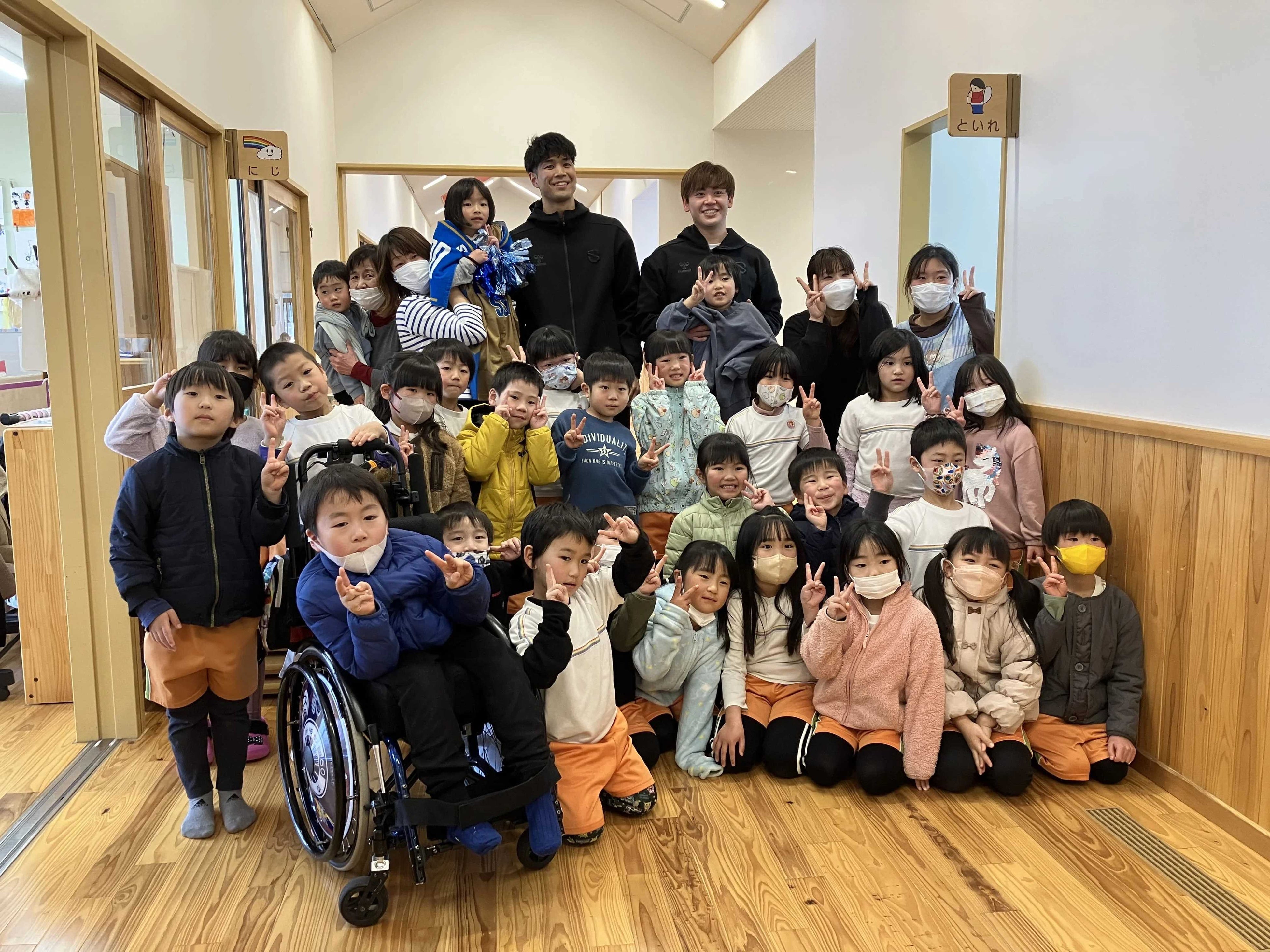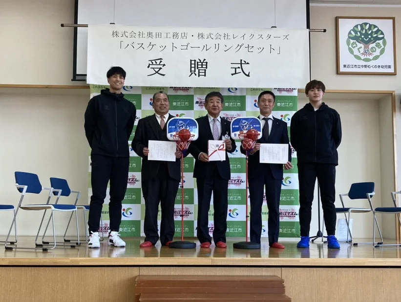 2月17日には寄贈先の一つである東近江市の中野むくのき幼児園を、東近江市の小椋正清市長、奥田工務店の北川昭市代表取締役社長、滋賀レイクスの釜渕俊彦代表取締役社長、選手を代表して杉浦佑成選手、星野京介選手が訪れて寄贈式を行いました。