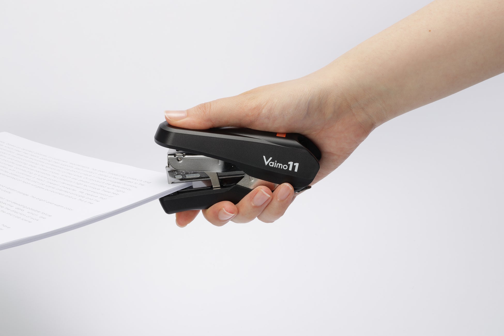 当社は2008年9月に当時ハンディホッチキスの主流であった20枚とじの倍の、40枚とじを実現した「Vaimo11 FLAT」を発売しました。『Vaimo11 Flarme』は、とじ作業を「快適にする」ことを追求して開発した「Vaimo11 FLAT」のフルモデルチェンジ品です。