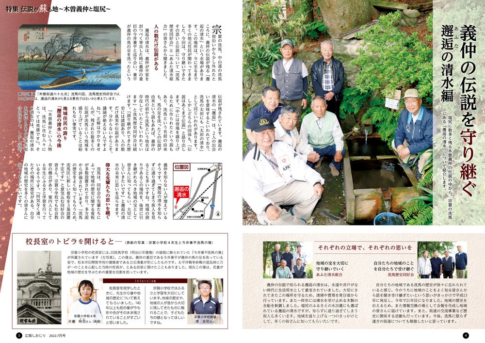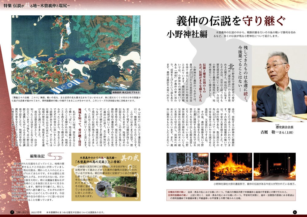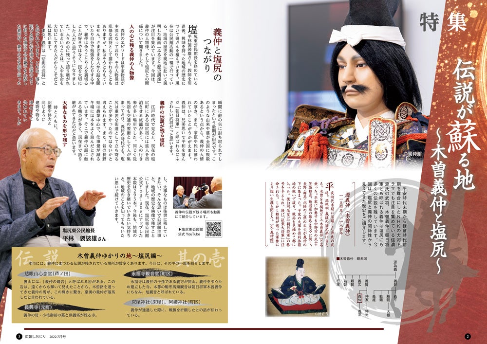 平安時代末期から鎌倉時代前期を舞台にしたNHKの大河ドラマでも注目を集めている信濃源氏の武将、木曽義仲。朝日将軍とも呼ばれる義仲は塩尻にも多くの伝説を残しています。広報塩尻7月号において、リニューアルの方針である「市民の目に止まる ページをめくりたくなる広報紙」に向けて、地域の魅力をお届けする特別企画を組みました。地域の歴史や伝説に触れることで、自分の住む地域に興味を持つきっかけにしてもらうため、塩尻と義仲の関係性から見えてきた歴史とそこに関わる地域の皆さんの思いを紹介します。