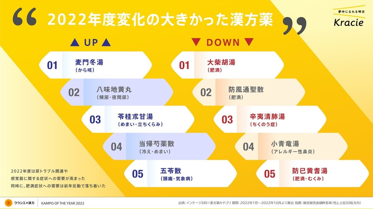 そこで今回は、当社に蓄積された販売データを基に、漢方薬の市場動向や購買者層の変化、2022年のヒット漢方について「KAMPO OF THE YEAR 2022」としてまとめました。本企画では、市場での漢方薬の動きから生活者が抱える不調を読み解き、当社独自の視点で今後の漢方を取り巻く流れを予測します。「KAMPO OF THE YEAR」は、漢方薬を通じてこの1年を振り返るきっかけになればとの想いから企画したもので、2023年以降も継続して実施する予定です。