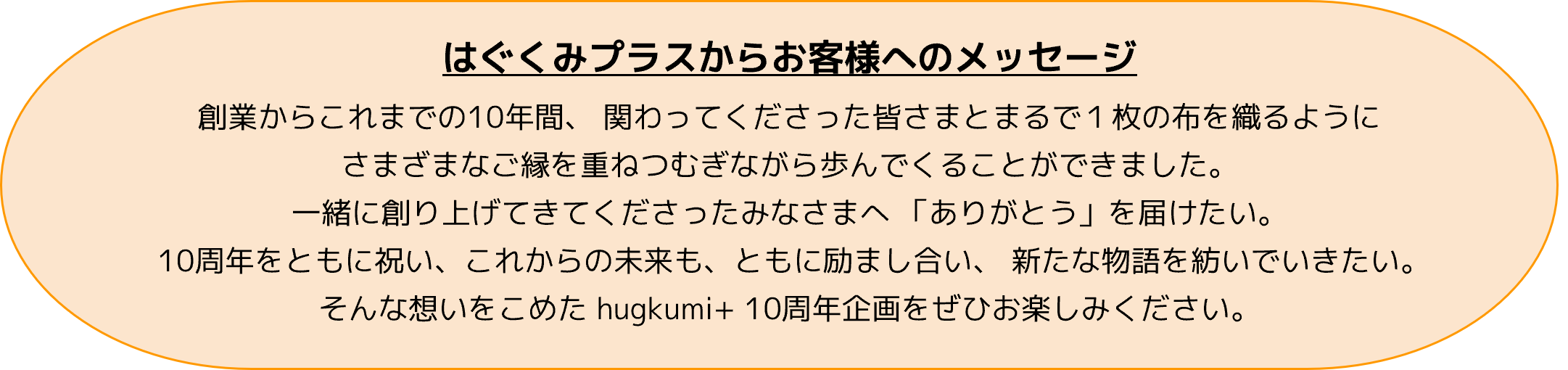 10周年の感謝を込めて、特別な価格でのご案内です。さらに、ご購入いただいた方には、次回以降でご使用いただける割引チケットをプレゼント致します。是非この機会にはぐくみプラスの商品をお楽しみ下さいませ。