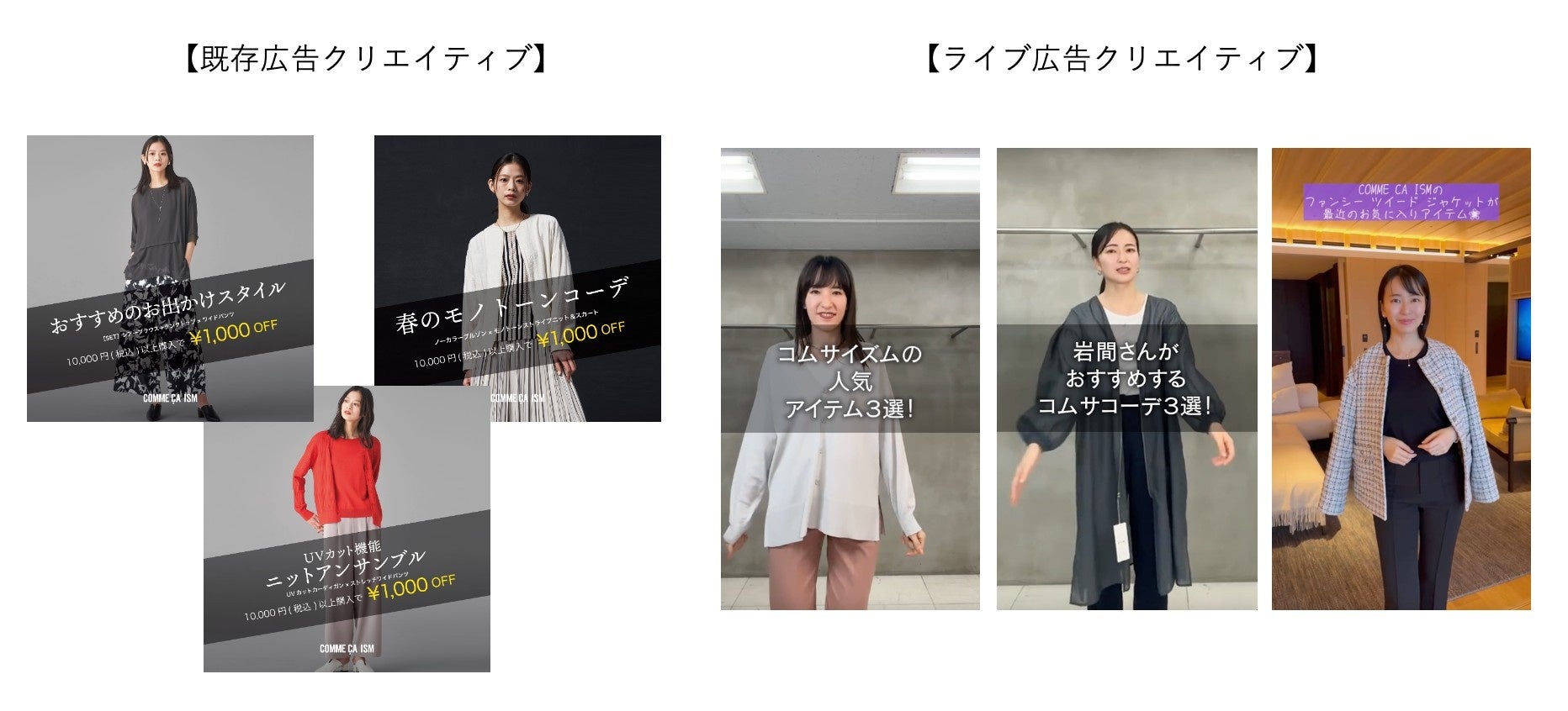 既存広告クリエイティブでは、特定の商品をメインとしたクリエイティブを作成、該当商品のページに遷移させる設計、ライブ広告クリエイティブ(ライブ配信から切り出したクリエイティブ)では、複数商品や起用モデルのコーディネートを紹介する動画からECのTOPページへ遷移させる設計をしました。既存広告では、特定の商品の購入を直接的に促すもの、ライブ広告はコーディネートを見せることで特定の商品だけでなくブランドへの興味喚起も狙ったという違いがあります。