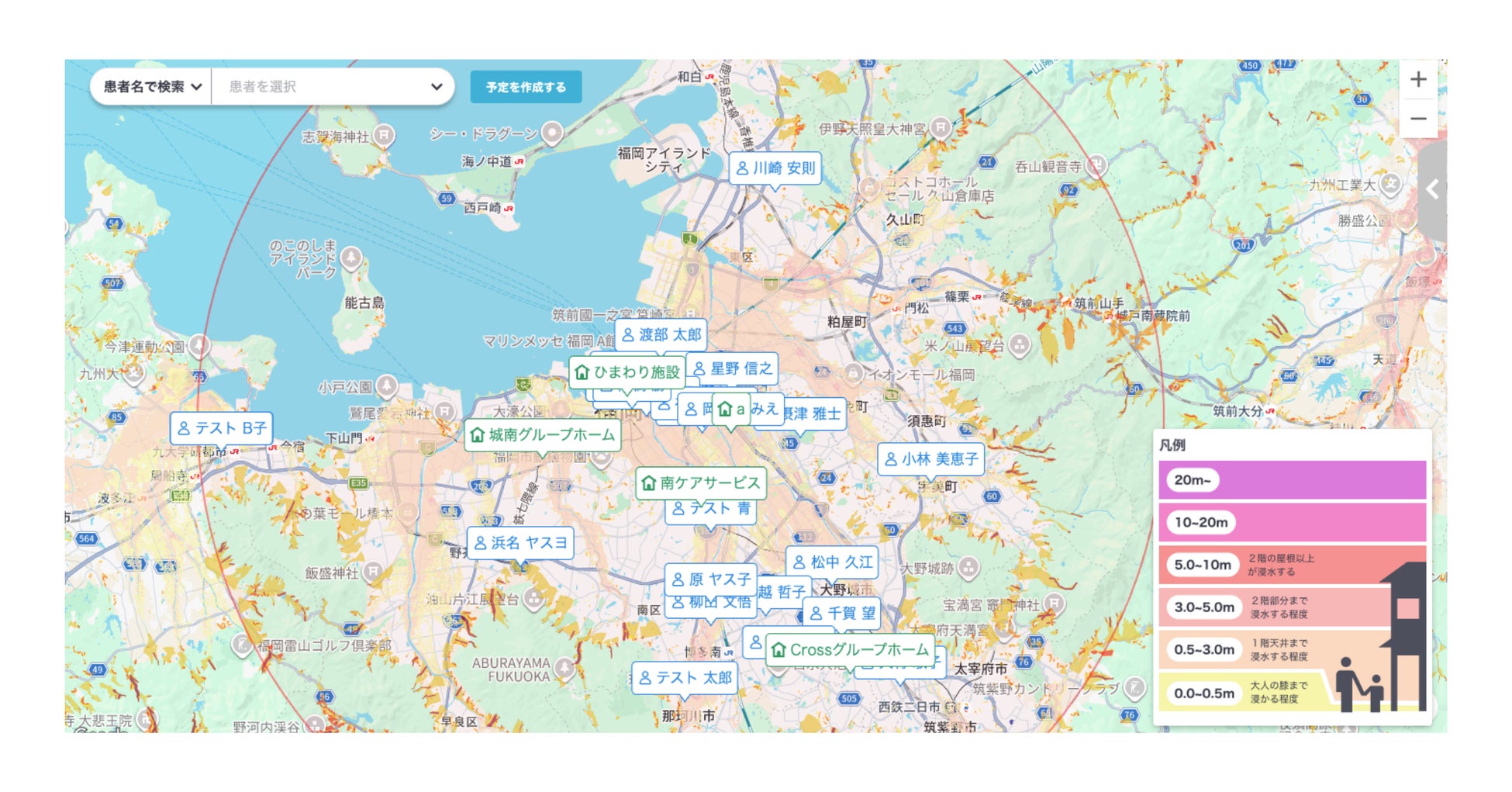 ・災害リスクの可視化: 患者の居住地マップ上に、地域のハザードマップをワンクリックで重ね合わせて表示。