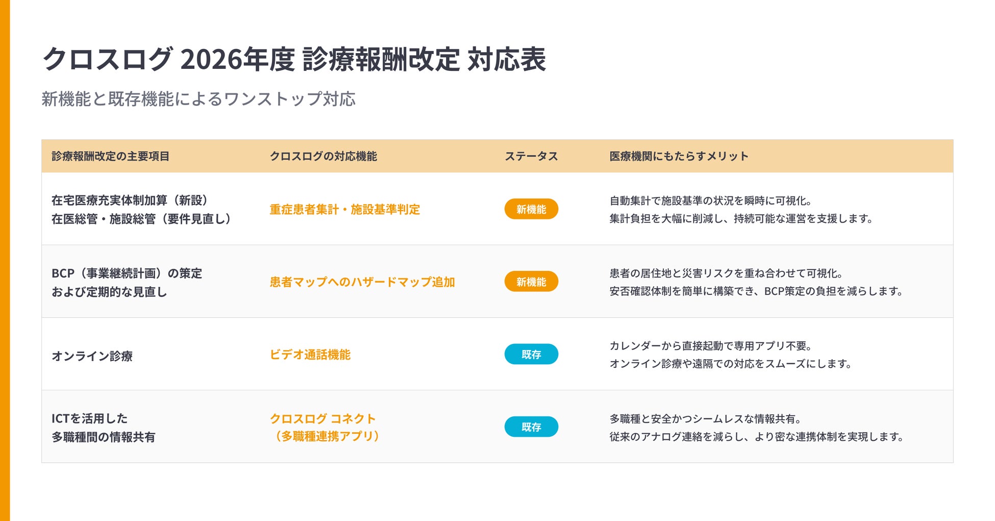 クロスログは今回の新機能にとどまらず、改定で推進される「オンライン診療」や「ICTを活用した多職種連携」にも対応しています。