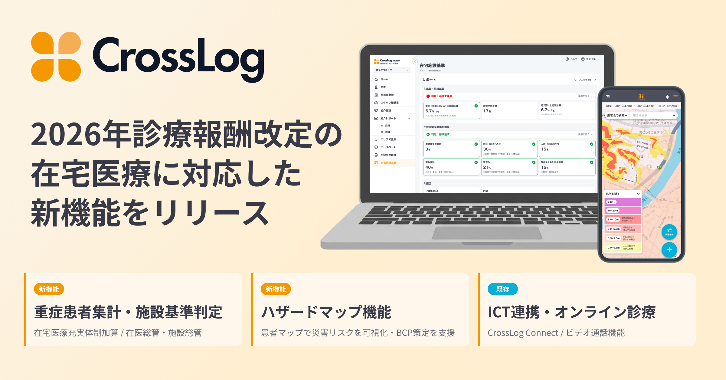 クロスログ株式会社(福岡市博多区、代表取締役CEO:宮原智新)は、在宅医療DX支援サービス「CrossLog(クロスログ)」において、2026年度(令和8年度)診療報酬改定の在宅医療における対応をサポートする新機能として、施設基準の自動判定機能およびハザードマップ機能をリリースしたことをお知らせいたします。