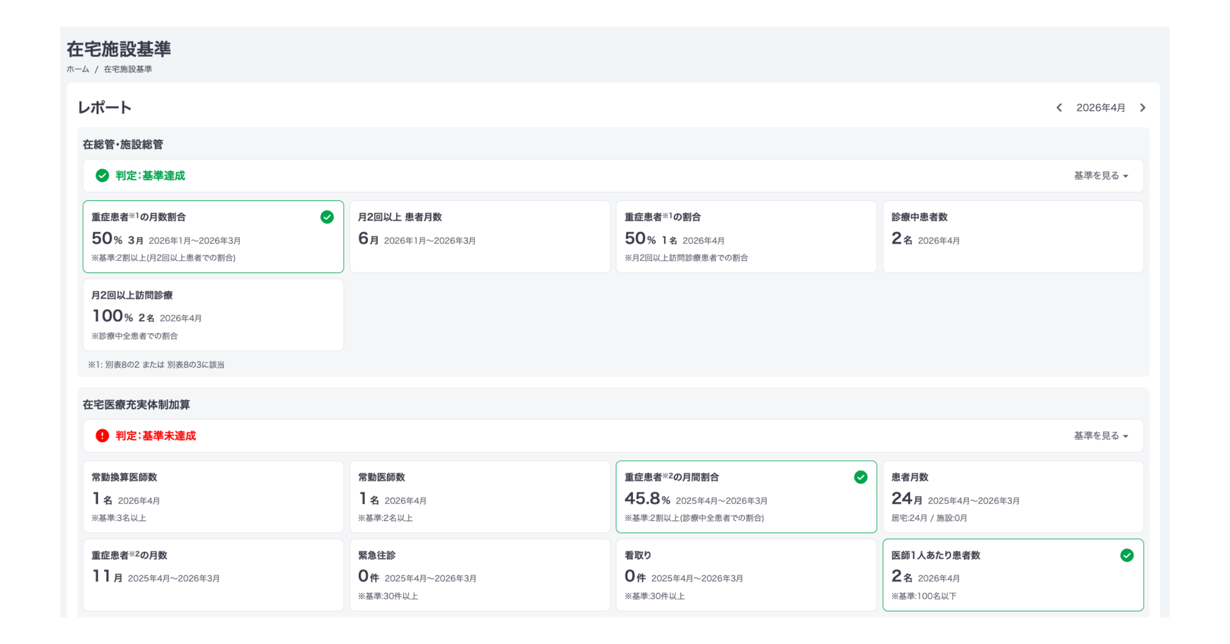・在医総管・施設総管 : 施設基準として求められる「月2回以上の訪問における重症患者の割合(別表8の2または8の3)」を自動集計。