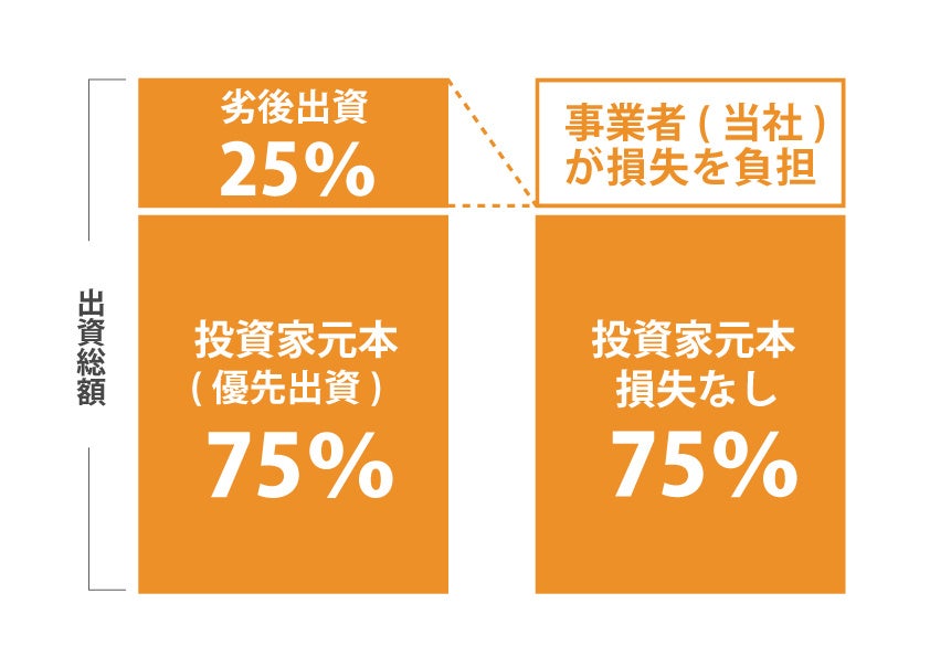 本ファンドは、優先出資割合75%、劣後出資割合25%と劣後負担割合が比較的高めに設定されています。これにより本出資者さまの出資元本の保全を図ります。