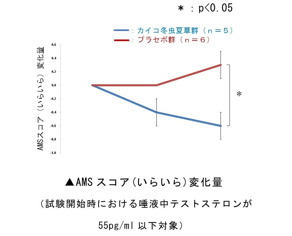 ● また、テストステロン値が低い性腺機能低下傾向者では、更年期症状の一部である「いらいら」、「疲労-無気力」が有意に改善しました。