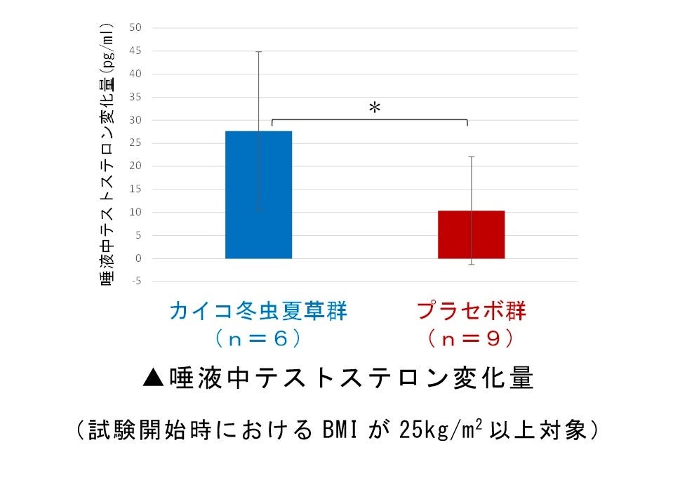 ● カイコハナサナギタケ冬虫夏草を摂取することで、BMIが25kg/m2以上の肥満傾向者において、唾液中テストステロンが有意に増加しました。