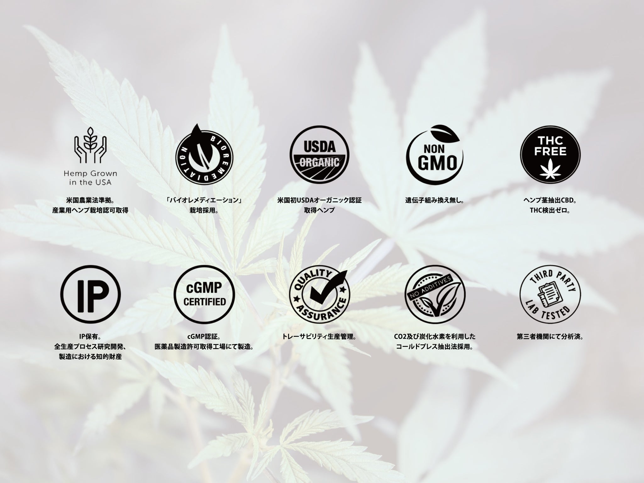 日本の法規制などの安全性をクリアした、USのオーガニックヘンプメーカーが栽培製造したCBD原料を使用しています。US初のUSDAオーガニック認証取得を始め、無農薬、遺伝子組み換え不使用等各種認証も取得しているプレミアムなCBDです。