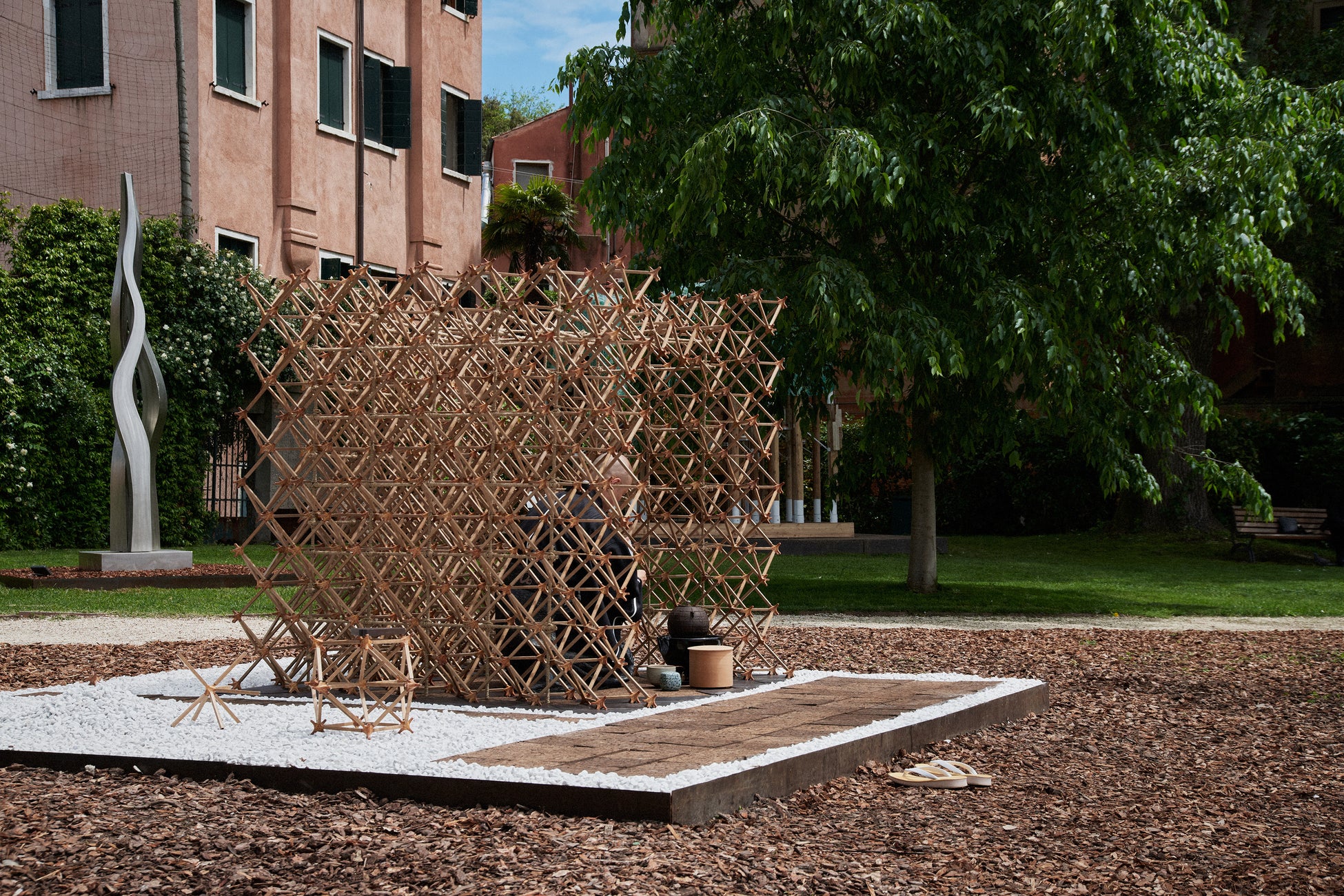 「ベネチ庵」・「アラビ庵」は、2023年、ヴェネチア・ビエンナーレに合わせて開催された「TIME, SPACE, EXISTENCE」展とドバイ・デザインウィークで発表した、世界で初めて食品廃棄物を構造体に用いた茶室の連作です。各地の緯度に基づき、日射操作で快適な空間をつくる、グローバルに展開できる形態生成アルゴリズムを構築。また、世界各地の特色ある食品廃棄物から建材を精製し、「100%土に還る」パビリオンを実現しました。小材からなる一連の建材はすべてスーツケースに収めて自主運搬・施工を可能とし、輸送時のCO2削減にも寄与。「グローバルとローカル」「資源の循環性」に対するアプローチとなっています。日本化工機材の角紙管は、構成材料が循環型の再生紙であること、リサイクル可能であることが評価され、素材として選ばれました。