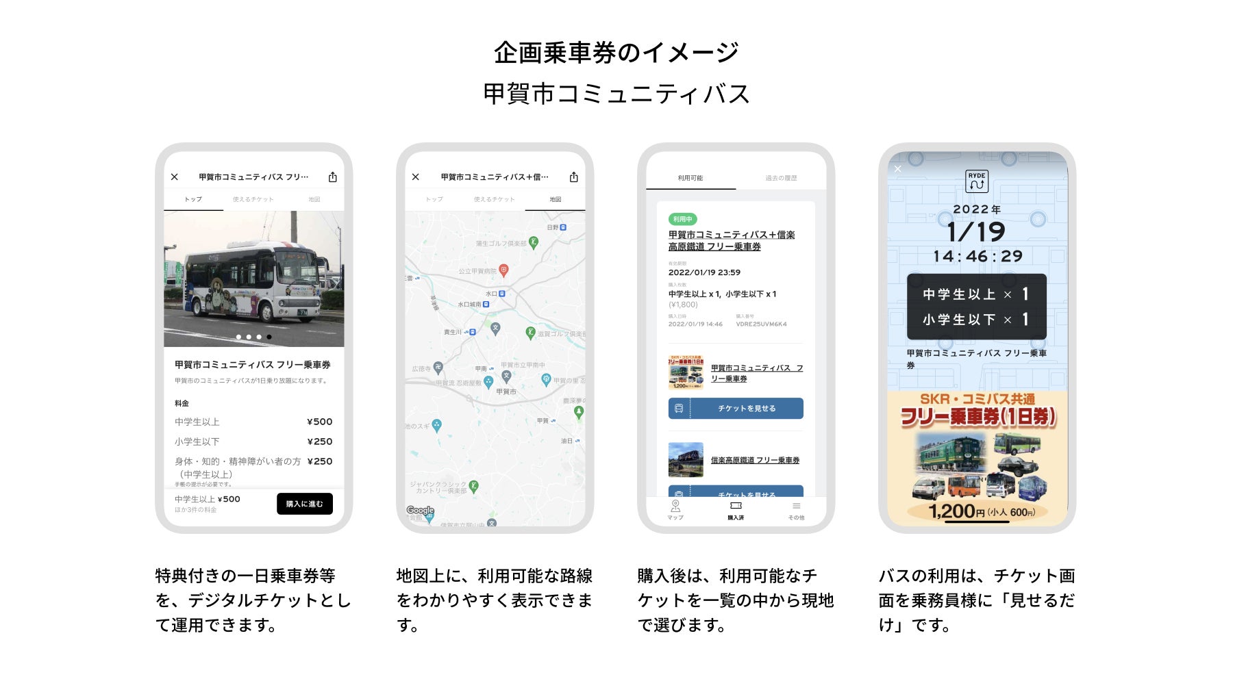 二次交通のDXを推進するRYDE株式会社(本社:東京都渋谷区、代表取締役 杉崎正哉、以下「RYDE」)と滋賀県甲賀市は提携を開始しました。RYDEが提供するモビリティプラットフォーム「RYDE PASS」上で2月5日(土)より、甲賀市内で運行するコミュニティバス初のデジタル乗車券2種「甲賀市コミュニティバスフリー乗車券」「SKR・コミバス共通フリー乗車券」の販売を行います。「RYDE PASS」の導入によって、お客様の利便性向上を図るほか、乗車券購入時の非対面・非接触を実現することで、感染症予防対策を努め安全な公共交通の提供を目指してまいります。