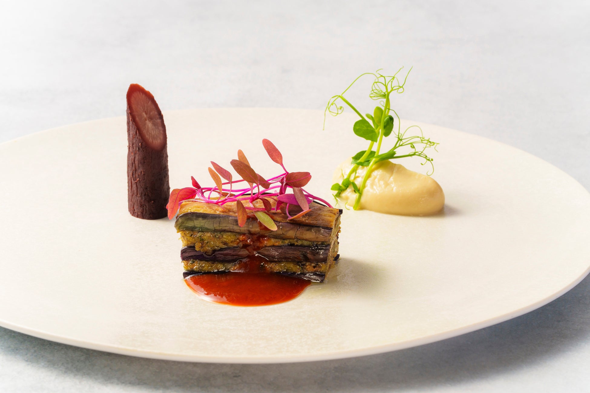 メインでご提供する「茄子のムサカ風」は、ソイミートと茄子を重ねて焼き、お肉の食感やしっとり感、甘みやうまみをしっかり感じていただけるメニューとなっております。