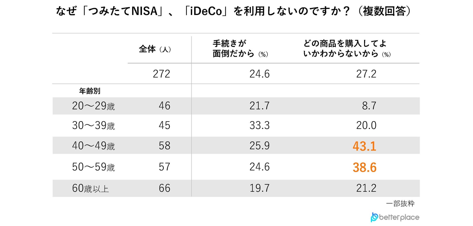「どの商品を購入してよいかわからない」という回答が27.2%と1番多く、次に「投資に回すお金がないから」25.0%、「手続きが面倒だから」24.6%と続きました。利用していない背景には、商品購入の選択および手続きのハードルの高さがあることがわかりました。