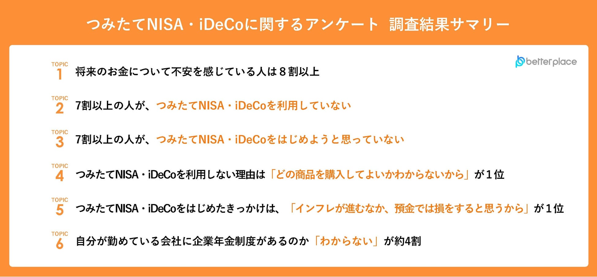 投資に関して正しい知識が得られる機会が増えれば、上記のような理由で将来の資産形成の機会を逃す人は減ります。私たちベター・プレイスは、働き盛り世代が、働く職場経由での投資知識の普及や、年金のDX化によって、誰もが取り残されることなく金融サービスの恩恵を受けられるよう、一層力を尽くしてまいります。