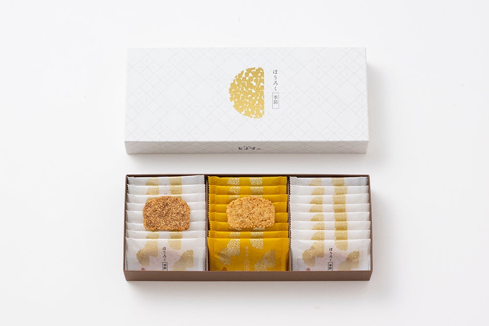 とよすの歴史を築いた“豊洲六郎”の名が由来の『ほうろく』は、とよすのこだわりと伝統を結晶にした自信作。『ほうろく』の特徴は、お米ひと粒ひと粒が感じられる独自の食感。昔ながらの製法“せいろ蒸し”でもち米を蒸しあげ、蒸しあがった熱いもち生地は、お米の粒を壊さないように手作業で丁寧に固めていくことで、その独自の食感を作り上げます。薄く焼き上げた『ほうろく』は、ひと粒ずつの食感と、カリっとした心地よい歯ごたえ、そしてもち米本来の素朴なおいしさを味わっていただけます。このたびは歴代『ほうろく』のフレーバーの中でも人気の高い、ごぼうが6年ぶりに復活。定番のしょうゆとのセットを、季節限定で販売いたします。