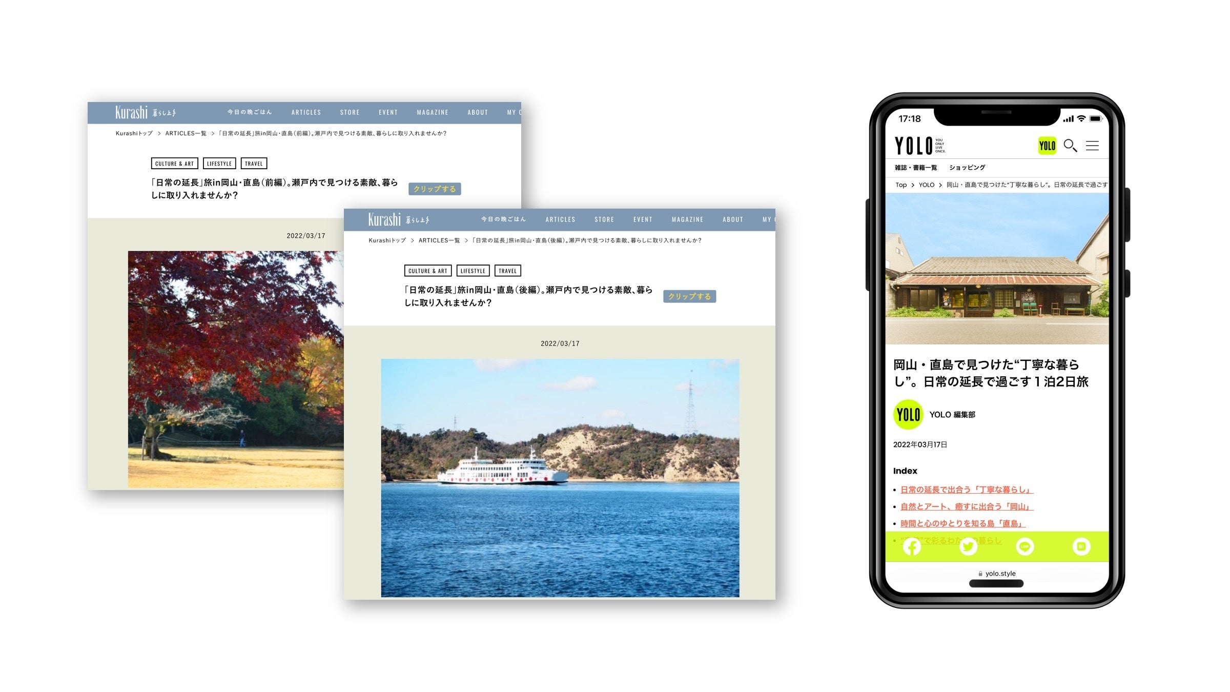 本取り組みは、Withコロナ下における瀬戸内エリア(岡山県岡山市・香川県直島町)の観光及び地場産業の活性化と、旅アトにまで瀬戸内の魅力が継続し、旅行者が豊かになることを目的として、岡山大学経済学部日髙優一郎ゼミ(専門:マーケティング)の学生5名(戸川真幹子さん、岩本慶樹さん、熊澤梨花さん、濱松あゆみさん、樋田海咲さん)が自ら企画・取材し、『暮らし上手』や『YOLO』のユーザーに合わせて寄稿しました。
