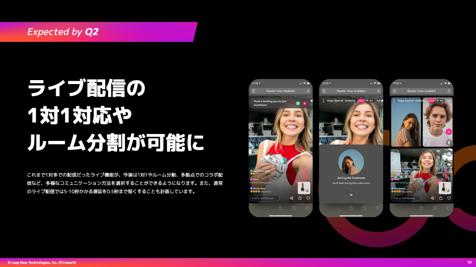 Fireworkでは、1対nでのライブ配信のみならず、1対1での接客やルーム分割での接客、コラボレーション配信などへ対応予定です。ユーザー様のビジネスに合わせて、顧客とのリアルタイムなコミュニケーション方法をご選択いただけます。