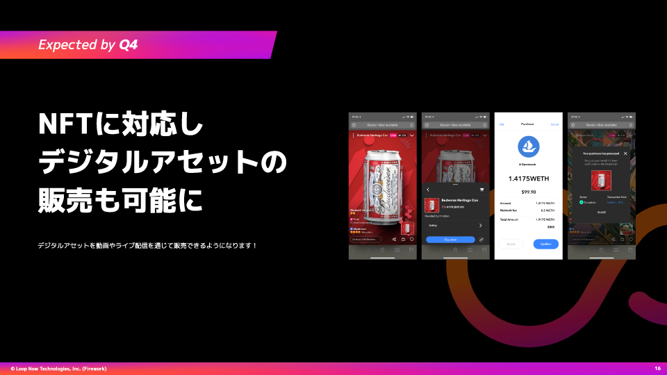 Fireworkでは、2022年後半にNFT対応のアップデートを予定しています。本機能が搭載されれば、ショッパブル動画やライブ配信を通じて、または動画そのものを、NFTアートとして誰でも簡単に販売できるようになります。