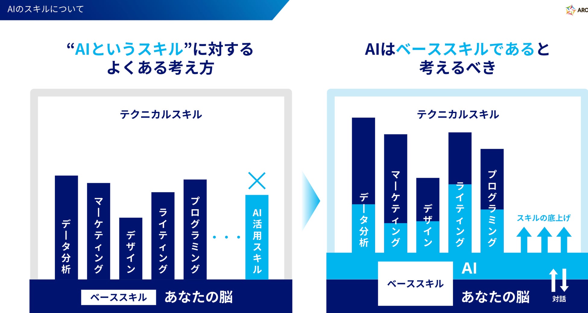 イベントのメインセッションでは、「生産性10Xの道」と題し、企業のAI活用成熟度を個人・組織レベルに応じて可視化する独自の“学習ステップ”や“スキルマップ”を紹介。