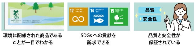 バイオマスマークは生物由来の資源(バイオマス)を利用した商品の品質や安全性が、関連法規、基準、規格等に適合していることを示すマークです。