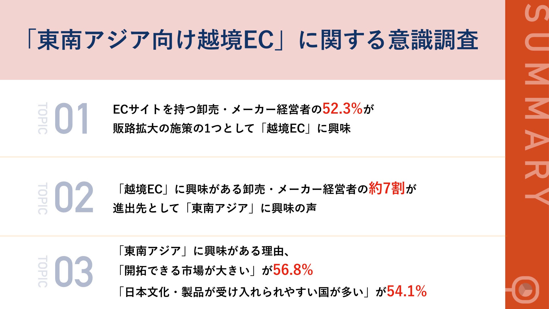 今回の調査では、ECサイトを持つ卸売・メーカー経営者が、販路拡大の必要性を感じており、販路拡大の手段として「越境EC」を積極的に取り入れようとしている方が多いことが判明しました。そして、具体的な販路拡大先として、開拓市場が大きく、日本文化・製品の受け入れやすいことを理由に、多くの人が「東南アジア」に魅力を感じていることも明らかになりました。越境ECを始める場合の開始時期として、年内を検討している場合が多く、コロナ禍で海外との行き来が難しい今だからこそ、緊急度かつ重要度の高い経営判断となっている様子が窺えます。経験もノウハウもない経営者にとって、越境ECに関して全面的にサポートしてくれる専門企業の存在は、今後の販路拡大に必要不可欠と言えるのではないでしょうか。