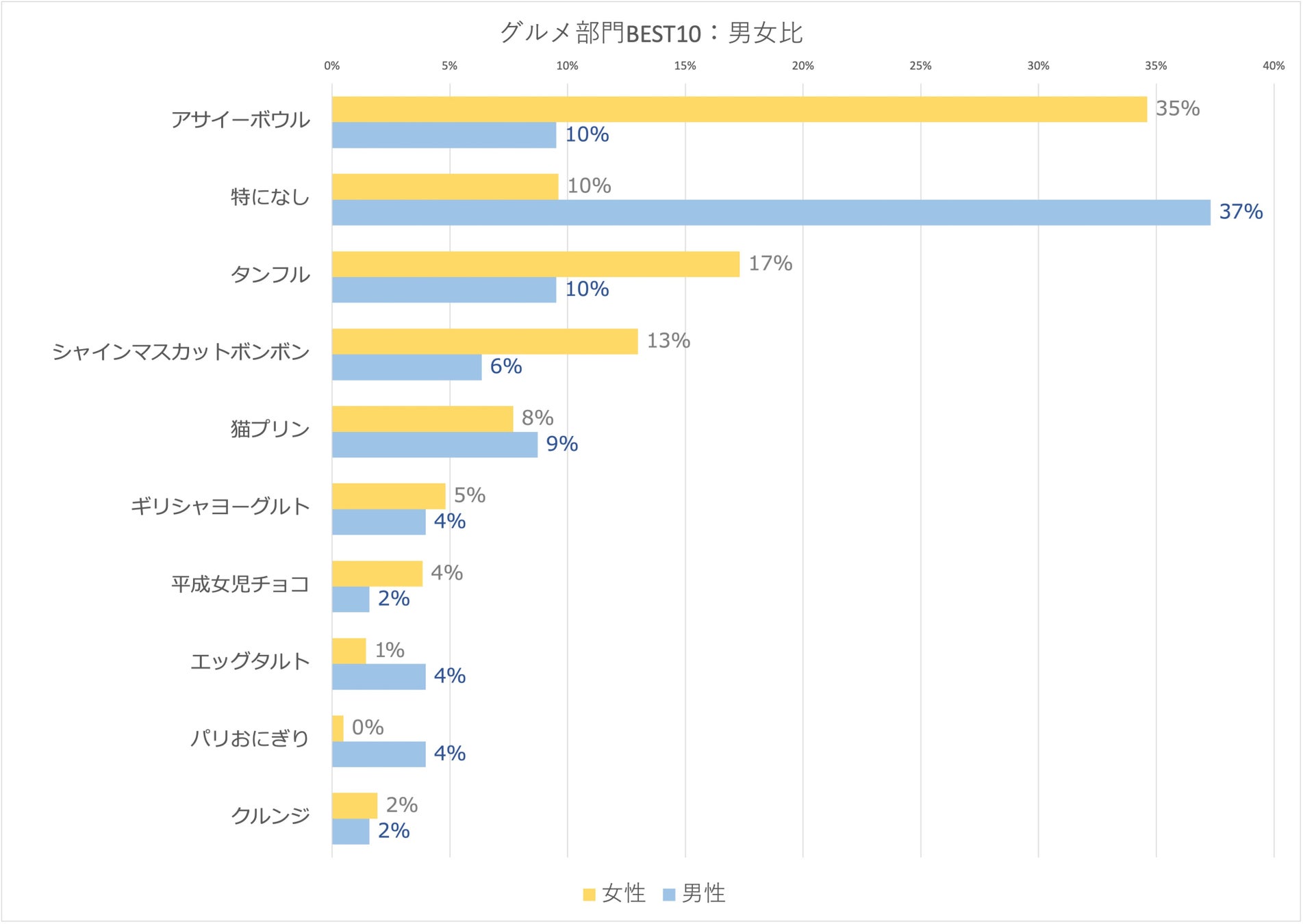 グルメという広義な質問ではあったが、回答の多くがスイーツであり、若年層が注目をしているジャンルが明確になった。また、男性は「特になし」という回答が多く、女性に比べてグルメに関する関心が薄いことがわかった。