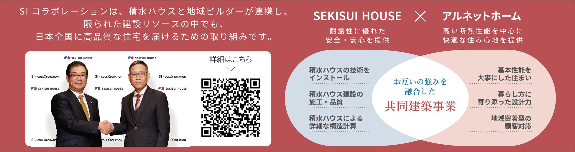 SI-COLLABORATIONとは、積水ハウスと地域ビルダーが連携し、限られた建築リソースを最大限活用し、日本全国に高品質な住宅の供給を目指す取り組みです。両社の強みを融合させることで、より多くの持続可能な家づくりの普及で豊かな暮らしに貢献したくSI事業締結に至りました。