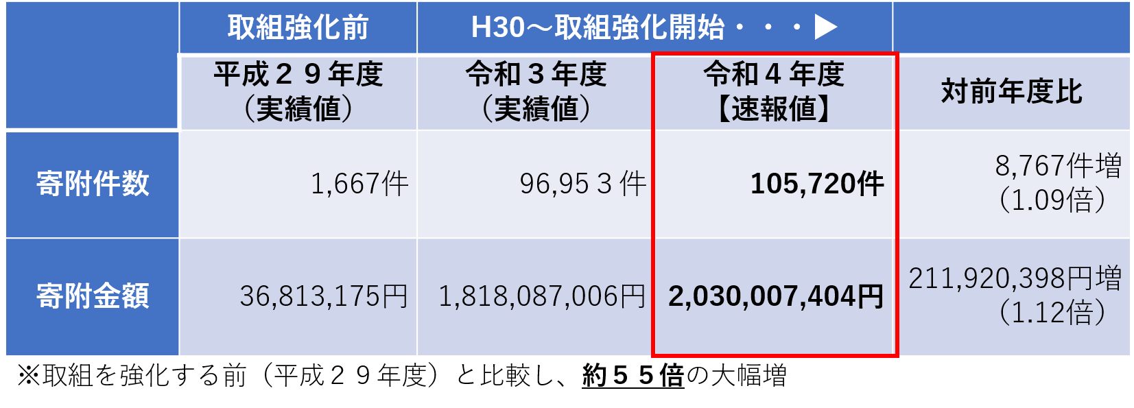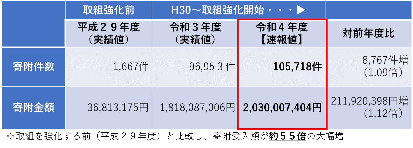 取組強化した平成30年度からの5年間で寄附受入額は約55倍に