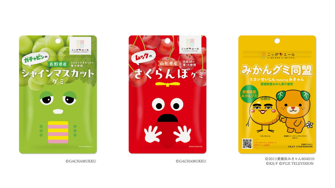 ”日本全国47都道府県から届けられる日本産のたべものに、そしてにっぽんに、ここからエールをおくろう。”がコンセプトの全農ブランド「ニッポンエール」と、世代を超えて人気のキャラクター「ガチャピン・ムック」、令和にパワーアップして復活した元祖シュール系キャラクターの「ミカンせいじん」、相棒として愛媛県イメージアップキャラクター「みきゃん」が登場するキャラクターコラボグミ3商品を発売します。