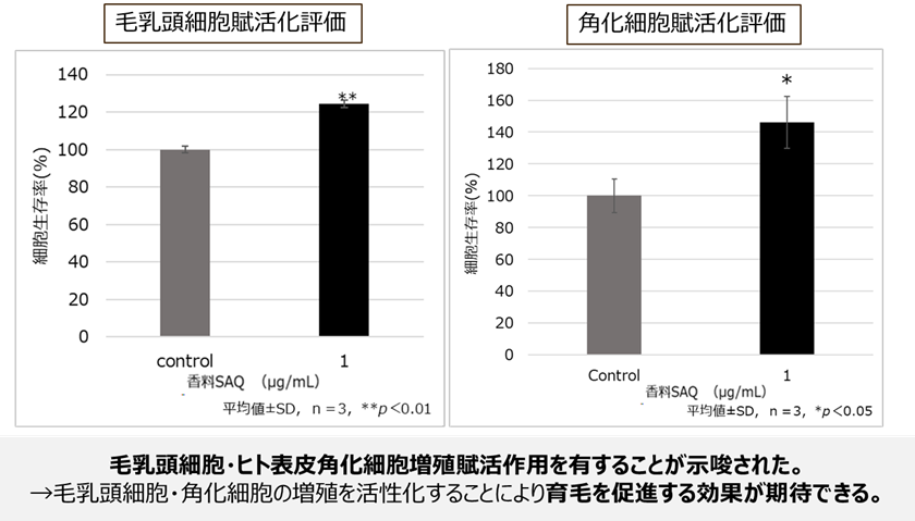 試験の結果、オリジナル香料には角化細胞、毛乳頭細胞ともに増殖させる効果が見られたことから、育毛促進作用が期待されます。
