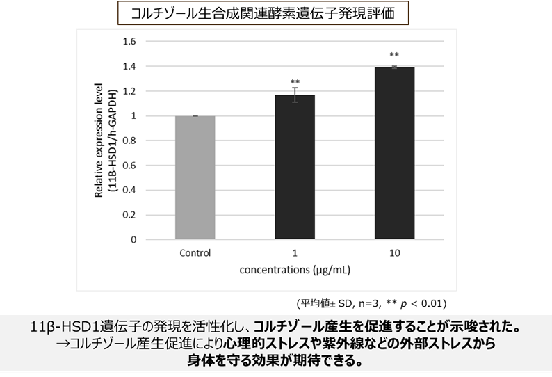 試験の結果、オリジナル香料が11β-HSD1遺伝子の発現を活性化し、コルチゾール産生を促進する効果が見られたことから、心理的ストレスや紫外線などの外部ストレスから身体を守り、ストレスの影響を緩和する効果が期待されます。
