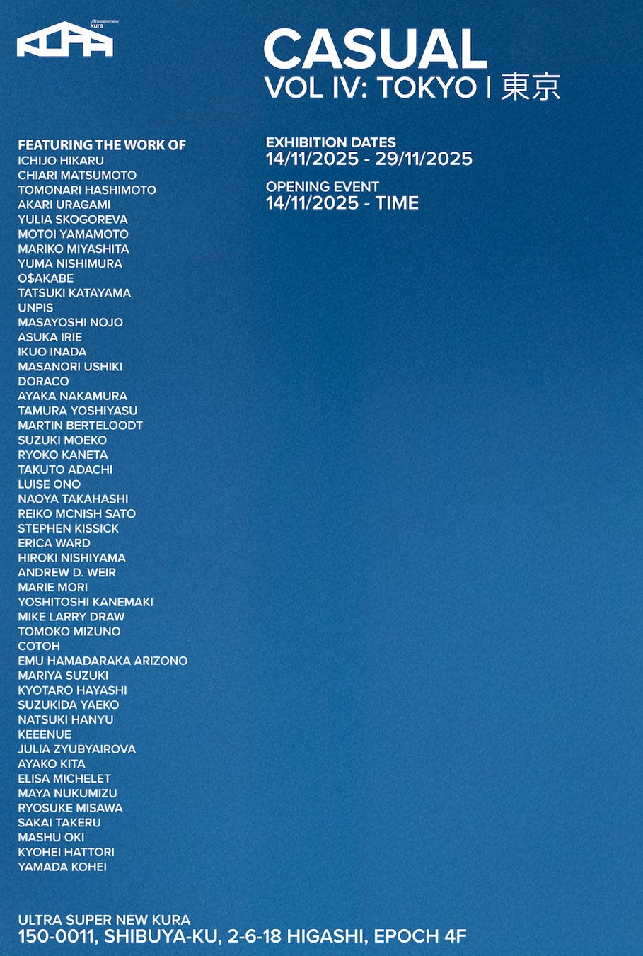 UltraSuperNew KURA の新しいスペースで、ついに初のグループ展を開催します!30名のアーティストが参加し、CASUAL Magazine にはさらに49名が登場。どんな展示になるのか、正直、私たちもまだ予測不能です。でもそれこそが楽しみ。ぜひ会場で、その瞬間を一緒に感じてください。