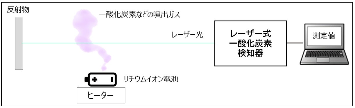 今回、当社の火災実験室「プラシオラボ」において、実際にリチウムイオン電池を加熱・発火させ、東京ガスエンジニアリングソリューションズ株式会社らが開発したレーザー式一酸化炭素検知器を用いて(図1)、発生した一酸化炭素を検知(図2)することに成功しました。
