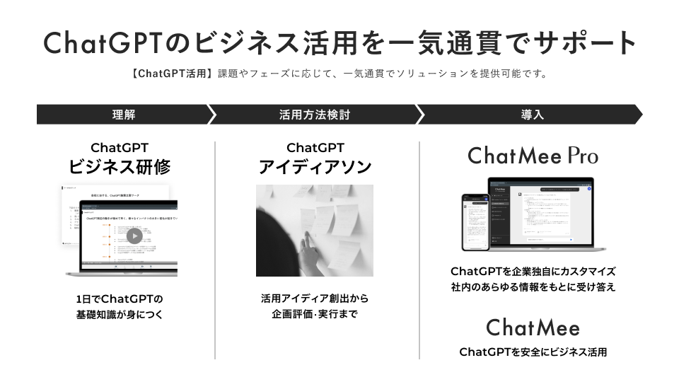 リテラシー教育、サービス提供、導入支援など、ChatGPTのビジネス活用を全方位でご支援します。
