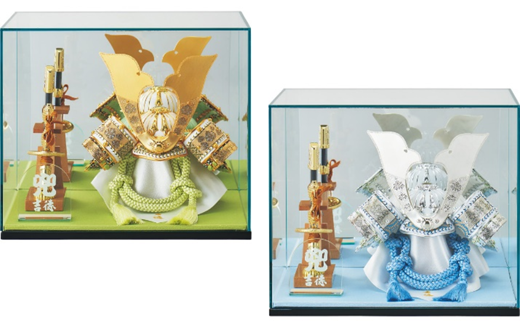 ケース飾りになっているため、箱から取り出すだけで瞬時に飾り付けが完了する、手間いらずの兜です。ケースは鏡面になっており、兜の背面の模様が映り込んで見た目も華やかに。5月の若葉や、澄んだ青空をイメージした色合いは飾るだけでお部屋に華を添えます。