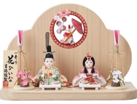 高さ22cm奥行18cmとコンパクトなサイズでありながら、背景のうさぎやビビットな着物が目を引く、意匠を凝らした平飾りで存在感のあるひな人形です。可愛らしいうさぎの瞳には、古来より魔除けの力があると信じられており、お子様を見守る守り神となるよう願いが込められています。