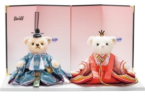 世界中で人気のテディベア「シュタイフ」のひな人形。お衣裳の柄のモチーフである「うさぎ」は飛び跳ねる姿から「飛躍」を表し、その長い耳は福を集めると言われています。また日本人がこよなく愛する「桜」もあしらい、春の風情を彩ります。