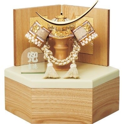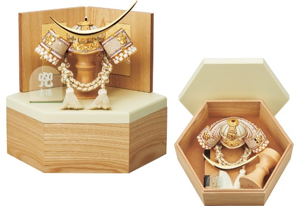 飾り台がそのまま収納箱になるデザインの兜です。木目調の収納飾りに日の光を閉じ込めたような温かみのあるパステルイエローをベースにした兜を合わせました。伊達政宗公の前立てを模した武将兜になっており、他にも「藤(上杉謙信)」「水(大鍬形)」の全3種類を用意しています。