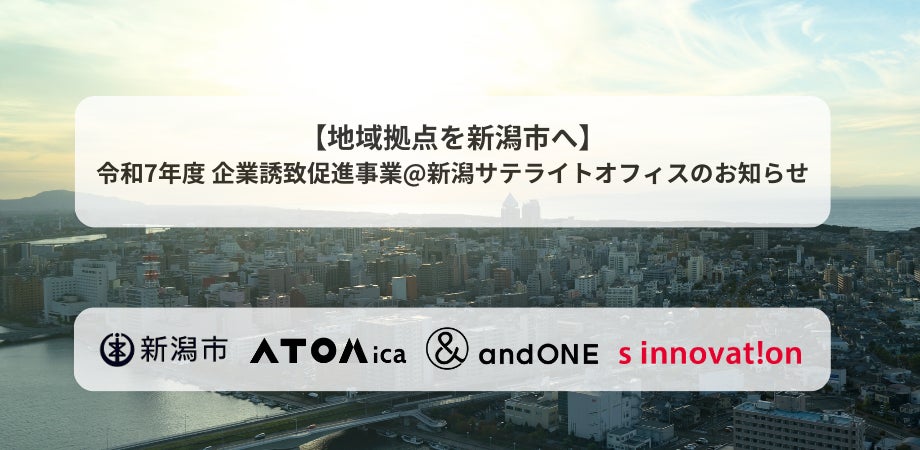 新潟市(行政)と、コワーキングスペースの運営等を全国展開する株式会社ATOMica(本社:宮崎県宮崎市、代表取締役Co-CEO 嶋田 瑞生、以下 ATOMica)、地方自治体向けの地域活性化活動を支援する株式会社andONE(本社:東京都中央区、代表取締役社長 長尾成浩、以下andONE)そしてエスイノベーション株式会社(本社:新潟県新潟市、代表取締役:星野 善宣、以下エスイノベーション)は連携し、令和7年度「企業誘致促進事業@新潟サテライトオフィス」を開始いたします。