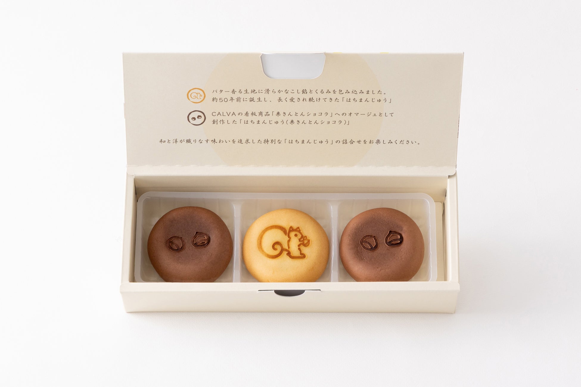 バター香る生地に滑らかなこし餡を包み、味わいのアクセントとして底面にクルミを添えた、和洋折衷のおまんじゅう「はちまんじゅう」。 そこに、〈CALVA〉の看板商品「栗きんとんショコラ」の趣を重ね、新たな味わいに仕立てました。「はちまんじゅう(栗きんとんショコラ)」は、ほっくりとしたなめらかな栗きんとん餡を、しっとり濃厚なチョコレート生地で包み、食感のよいクルミを底面に添えた、深みのある味わいのおまんじゅうです。和と洋が織りなす味わいを追求した2種類の「はちまんじゅう」をお楽しみください。