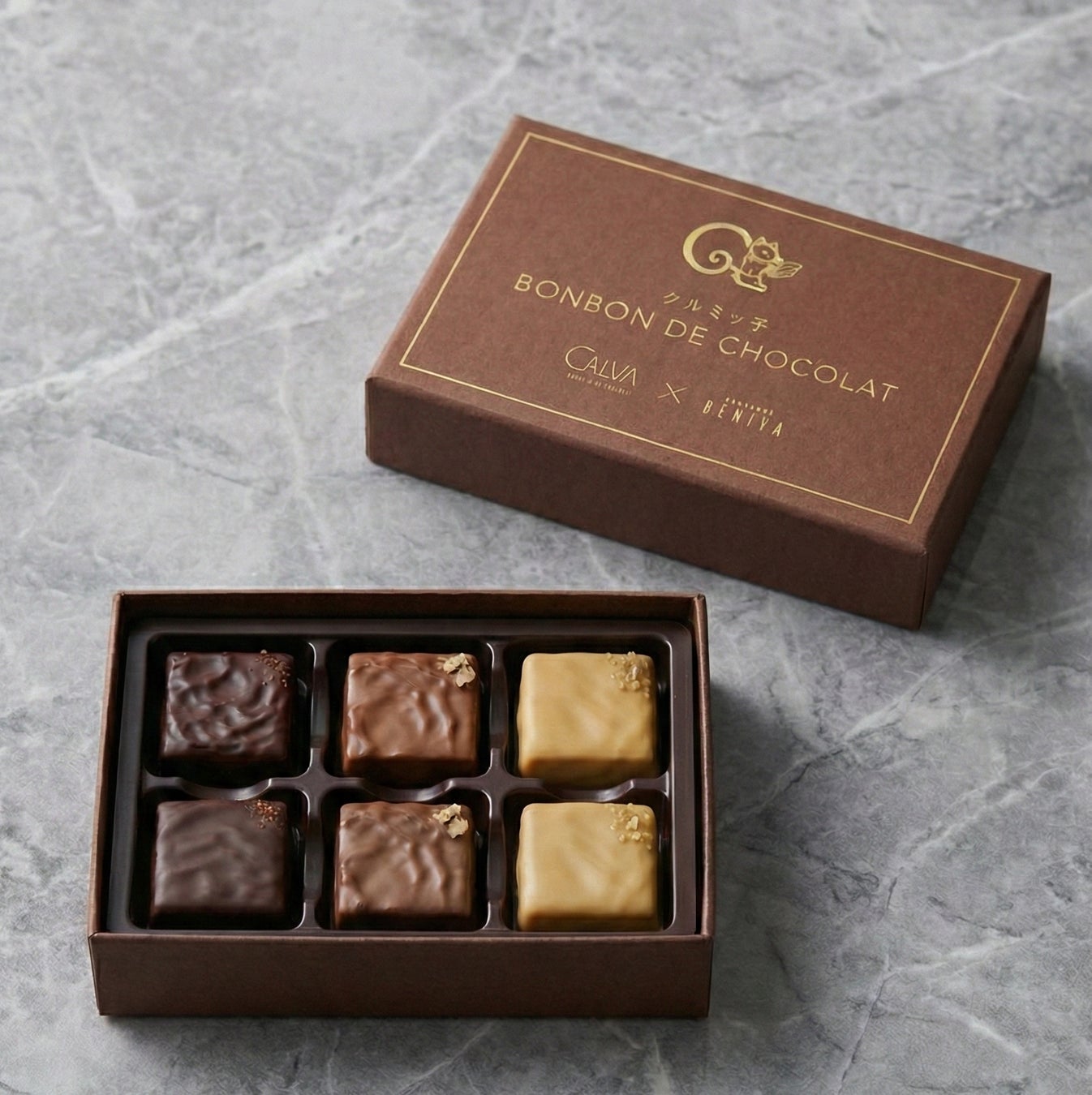 もう一つのコラボレーション商品としてCALVA出店ブースでは、新たに「クルミッ子 BONBON DE CHOCOLAT」を販売します。「クルミッ子」の味わいを、ボンボンショコラという小さな世界にどう表現するか。試作を重ね、サブレ生地とクルミ入りキャラメルショコラを合わせた自信作が完成しました。さらに、外側のチョコレートを3種変えることで、カカオの個性が「クルミッ子」の魅力を様々に引き立てます。