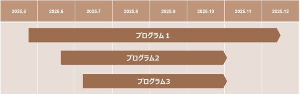 全3つのプログラムを1プログラムずつ実施予定です。全てのプログラムへの参加を推奨しておりますが、各プログラムが独立しておりますので、興味のあるプログラムだけに参加していただくことが可能です。