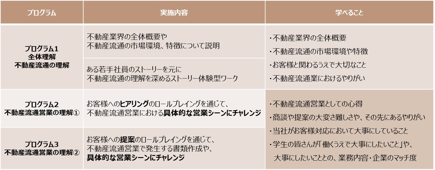 三菱地所グループにおいて不動産売買の仲介、賃貸の仲介・管理を担う三菱地所ハウスネット株式会社(本社所在地:東京都新宿区北新宿2-21-1 取締役社長:平川清士)は、今年度も5月から12月の期間に、2027年卒の学生を対象とした仕事体験を開催いたします。本プログラムは、学生一人ひとりの関心や理解度に応じて参加できるよう、全3種類の仕事体験を複数回にわたり実施するものとなっております。不動産業界のリアルな現場を体感できる貴重な機会となっておりますので、その実施概要をお知らせいたします。