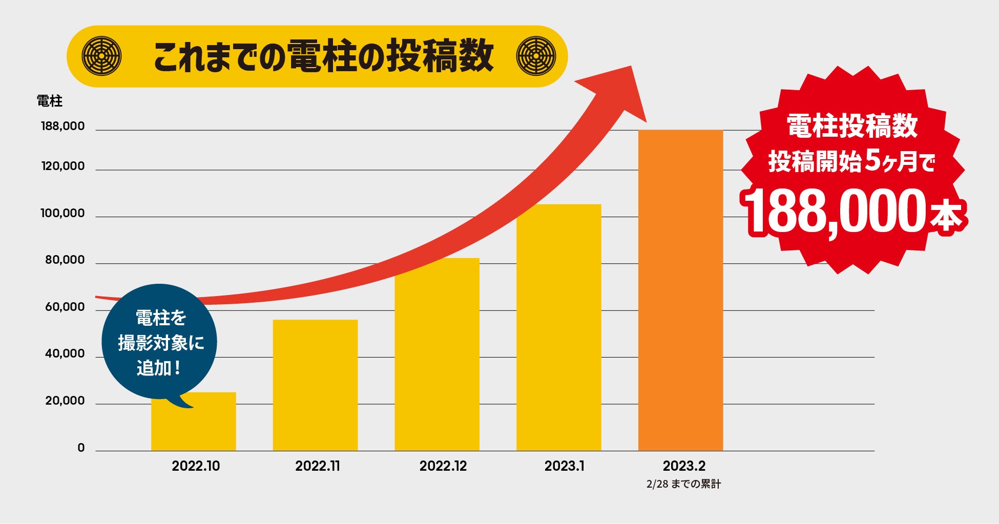 また電柱は、10月から新たなインフラ撮影対象として加わってから約5か月が経過し、今まではマンホール撮影をメインとしていたシチズンも、徐々に電柱を撮影するようになり、投稿スピードは上がっています。2月より電柱を300本撮るとポイントが3倍獲得できるキャンペーンの効果もあり、1月から56%増の、188,000本を超える電柱データが集まっています(2023.2.28現在)。