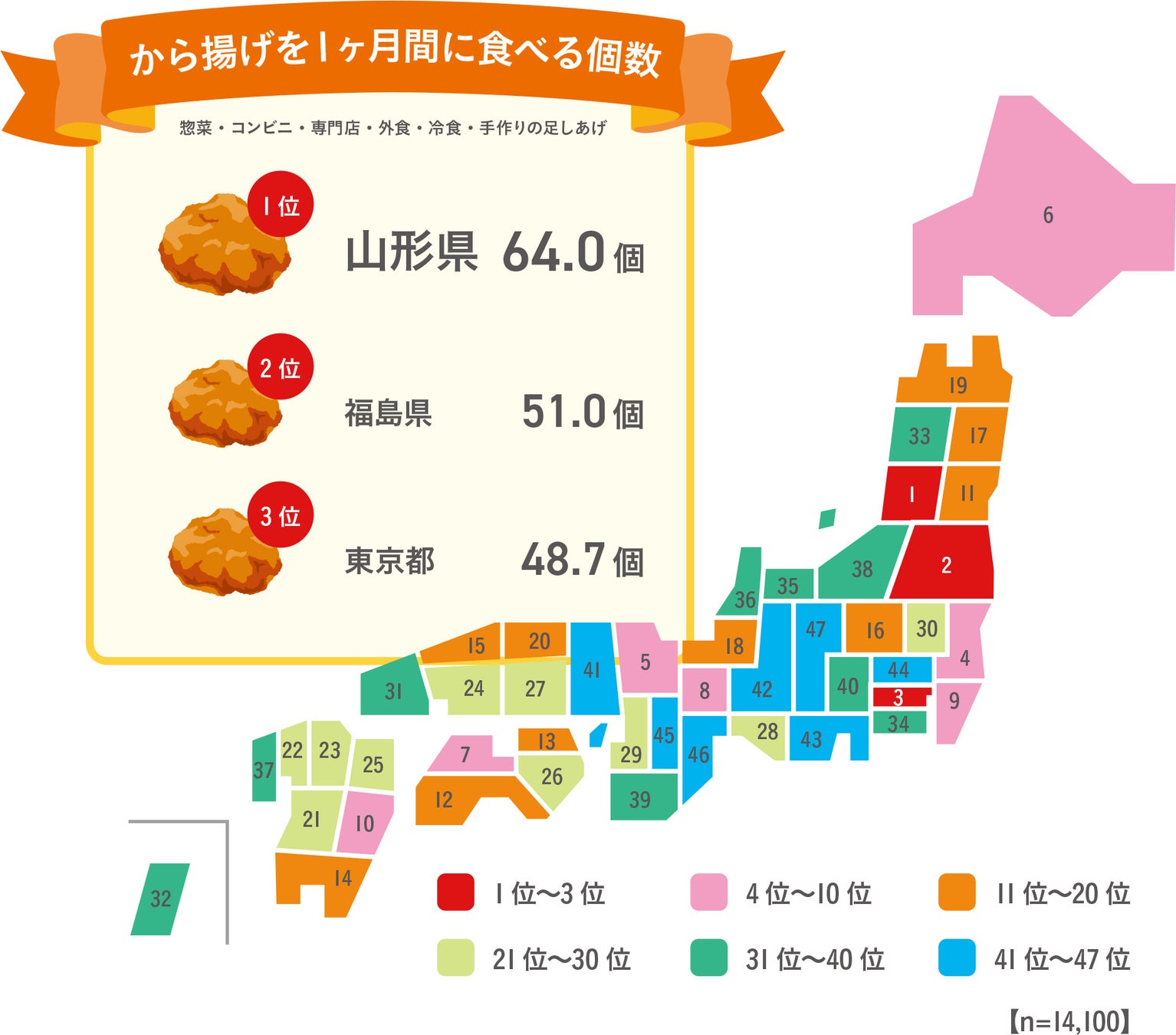 - から揚げ1ヶ月間平均喫食個数*1ランキング、第1位の都道府県は「山形県(64.0個)」!