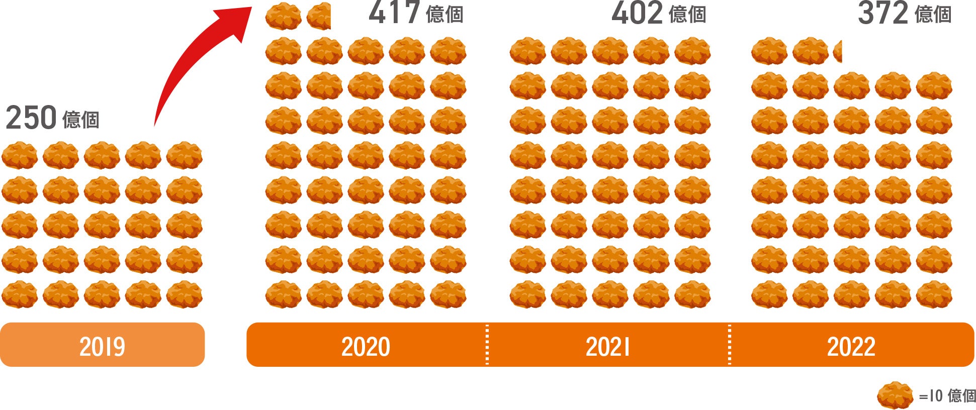 - から揚げの年間総消費量は約370億個!?〔推計値*3〕巣ごもり需要による急伸は一服の感も、コロナ禍前と比較した消費量は約150%に!
