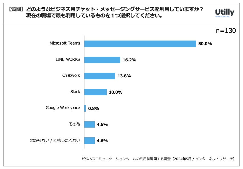 職場におけるビジネス用チャット・メッセージングサービス利用者の50.0%がMicrosoft Teamsを利用していると回答した