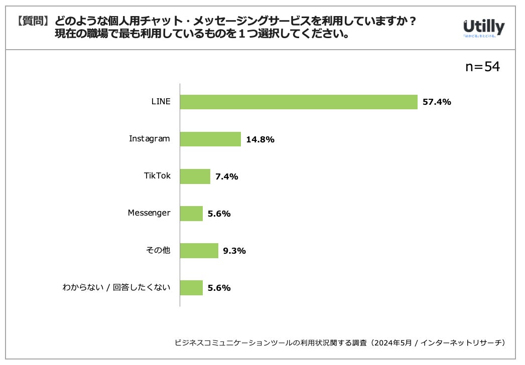 職場における個人用チャット・メッセージングサービス利用者の57.4%がLINEを利用していると回答した。LINEに次いで利用されているサービスはInstagramで14.8%であった。