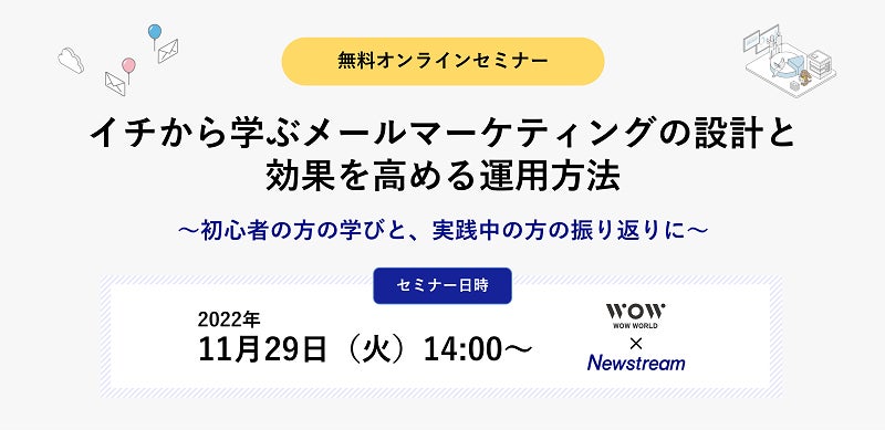 自社開発システム「WEBCAS(ウェブキャス)」と「WOW engage(ワオエンゲージ)」を通して、企業のマーケティングとカスタマーサクセスにおけるコミュニケーションの課題解決を支援する株式会社WOW WORLD(ワオワールド/本社:東京都品川区、代表取締役社長:美濃 和男、以下、WOW WORLD)は、グループ会社でデジタルマーケティングの戦略立案と実行を支援するニューストリーム(本社:東京都港区、以下、ニューストリーム、代表取締役社長:西川 拓杜)と共催で、「メールマーケティングの効果を倍増させる設計のポイント」をテーマにした無料オンラインセミナーを、2022年11月29日(火)に開催いたします。